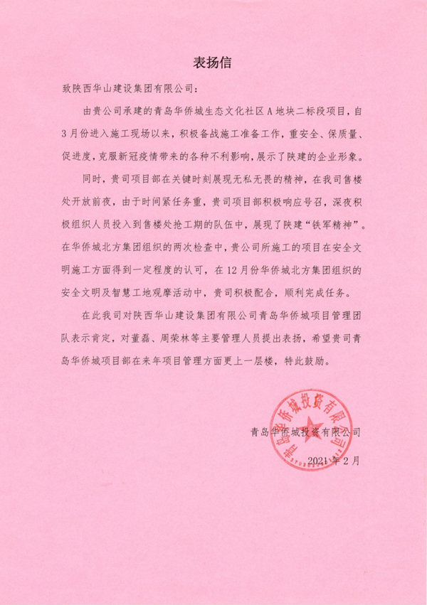 近日,青島華僑城生態(tài)文化社區(qū)施工Ⅱ標(biāo)段項(xiàng)目部收到了一封來自建設(shè)單位的表揚(yáng)信,信中對項(xiàng)目部克服疫情影響、無私無畏推進(jìn)項(xiàng)目建設(shè)給予贊賞,對項(xiàng)目管理團(tuán)隊(duì)在工程建設(shè)中的突出表現(xiàn)給予肯定并提出表揚(yáng)。