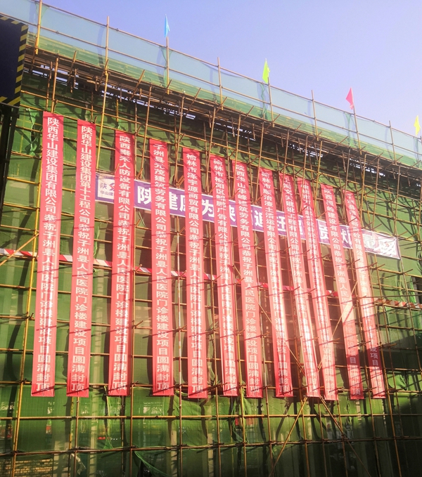 子洲縣發(fā)改局副局長崔奮榮、質監(jiān)站站長白棟,子洲縣人民醫(yī)院、第十工程公司及項目部全員以及合作單位負責人等60余人參加封頂儀式。