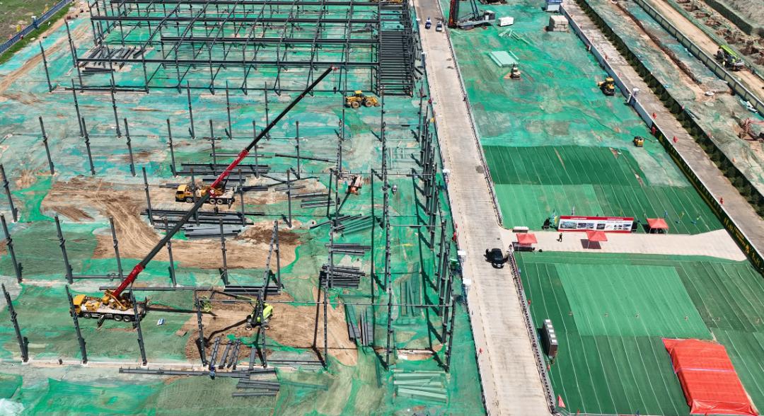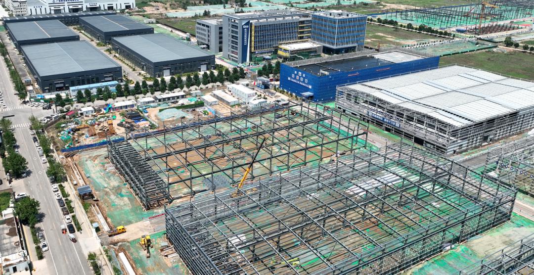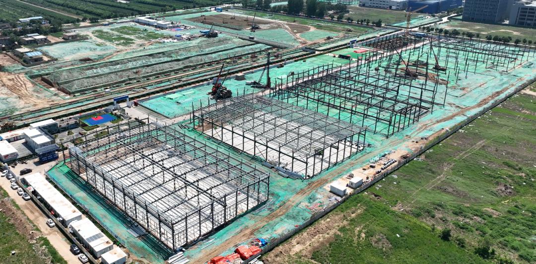 二期項(xiàng)目由2棟11.5米高單層鋼結(jié)構(gòu),4棟11.9米高單層鋼結(jié)構(gòu),1棟12.3米高2層鋼筋混凝土框架結(jié)構(gòu)工業(yè)廠房組成。截至目前,7號(hào)廠房二次結(jié)構(gòu)完成,外墻抹灰完成30%;5號(hào)廠房外墻維護(hù)板完成50%,混凝土地面施工完成75%;6號(hào)廠房鋼柱、鋼梁吊裝完成;1-4號(hào)廠房鋼柱、鋼梁吊裝完成,檁條安裝完成。