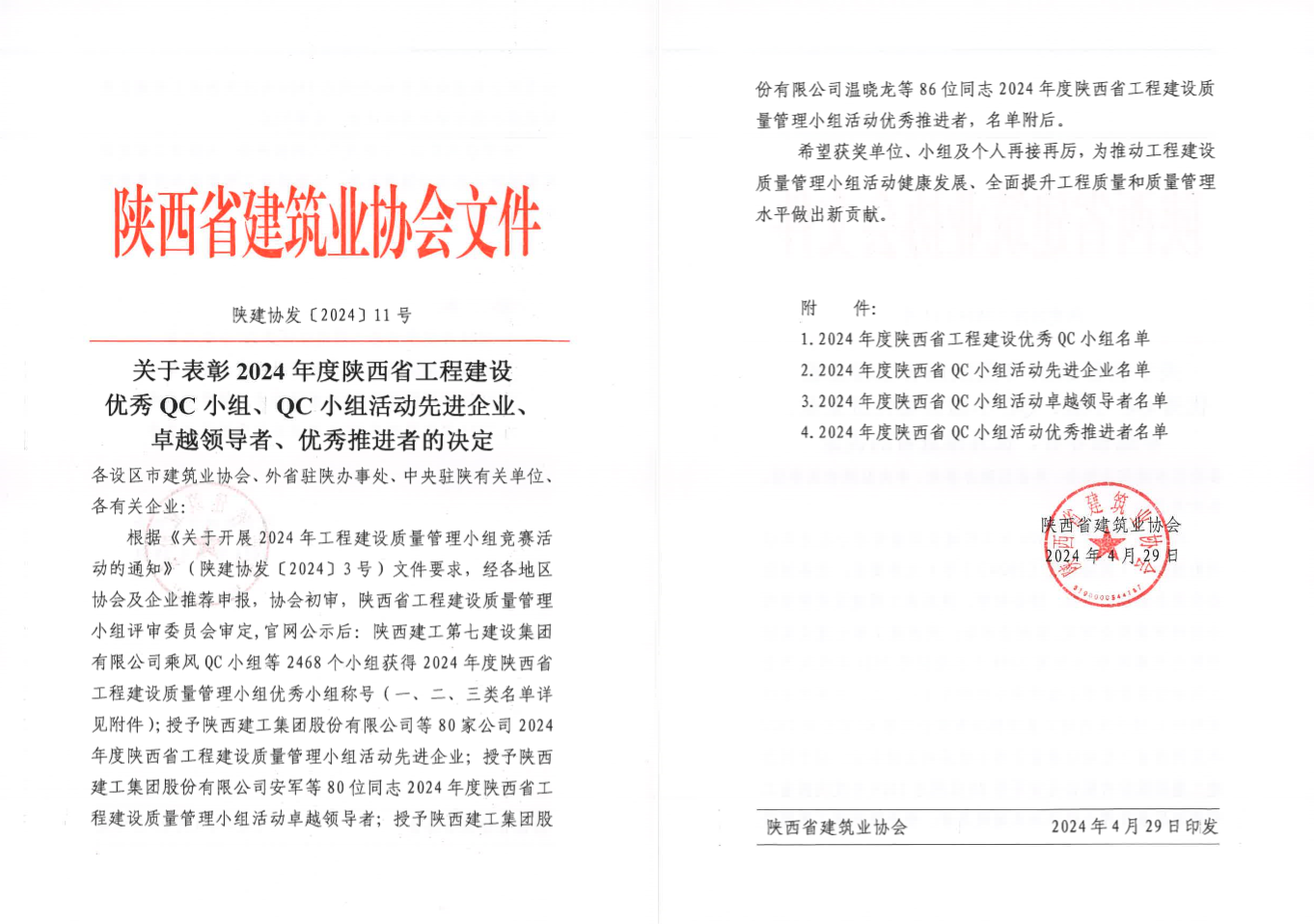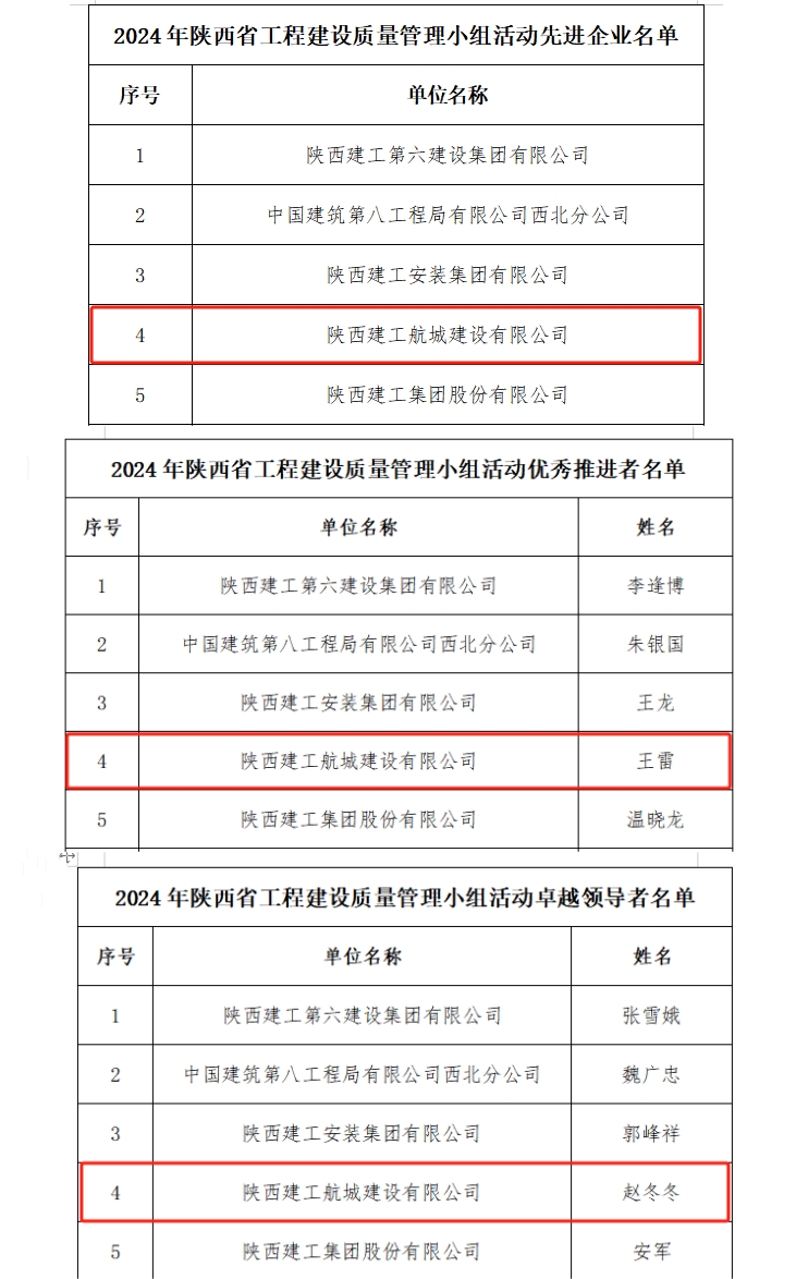 近日,陜西省建筑業(yè)協(xié)會公布了2024年陜西省工程建設(shè)優(yōu)秀QC小組、QC小組活動先進企業(yè)、卓越領(lǐng)導(dǎo)者和優(yōu)秀推進者名單。陜建航城公司榮獲“2024年陜西省工程建設(shè)質(zhì)量管理小組活動先進企業(yè)”,公司總工程師趙冬冬被評為“2024年陜西省工程建設(shè)質(zhì)量管理小組活動卓越領(lǐng)導(dǎo)者”,公司質(zhì)量負責人王雷被評為“2024年陜西省工程建設(shè)質(zhì)量管理小組活動優(yōu)秀推進者”。